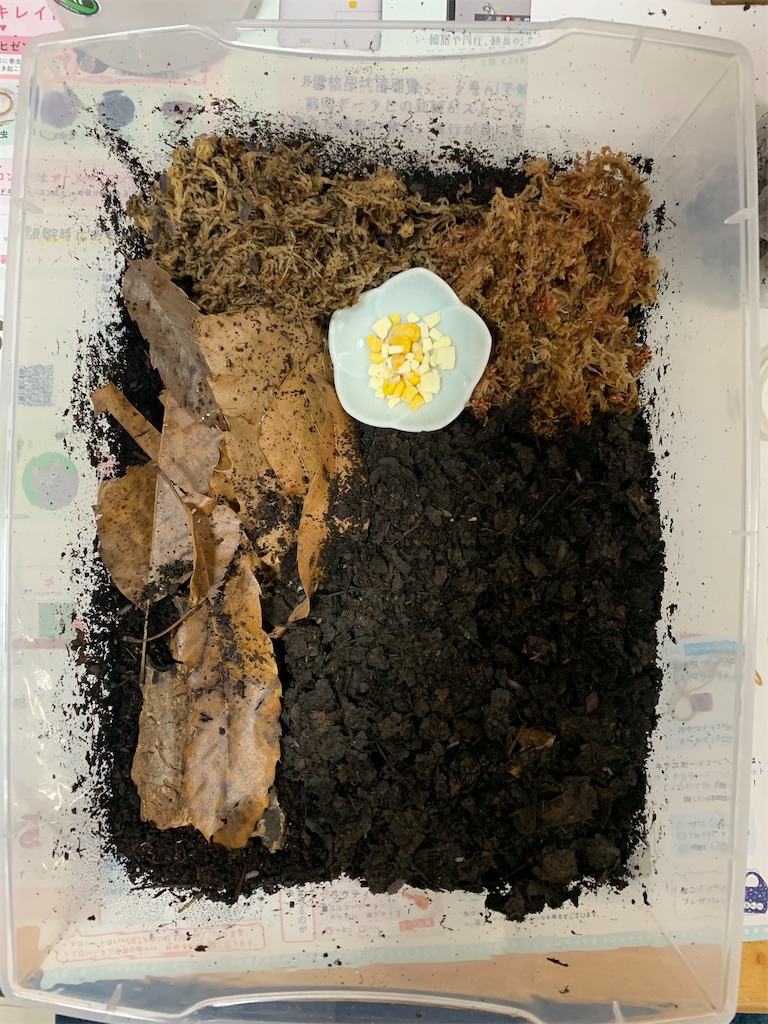虫かごから、枯れ葉や樹皮、水苔を移動。